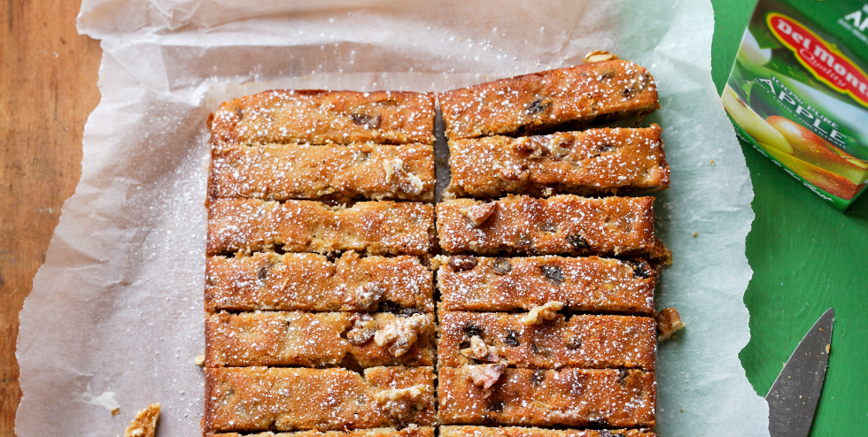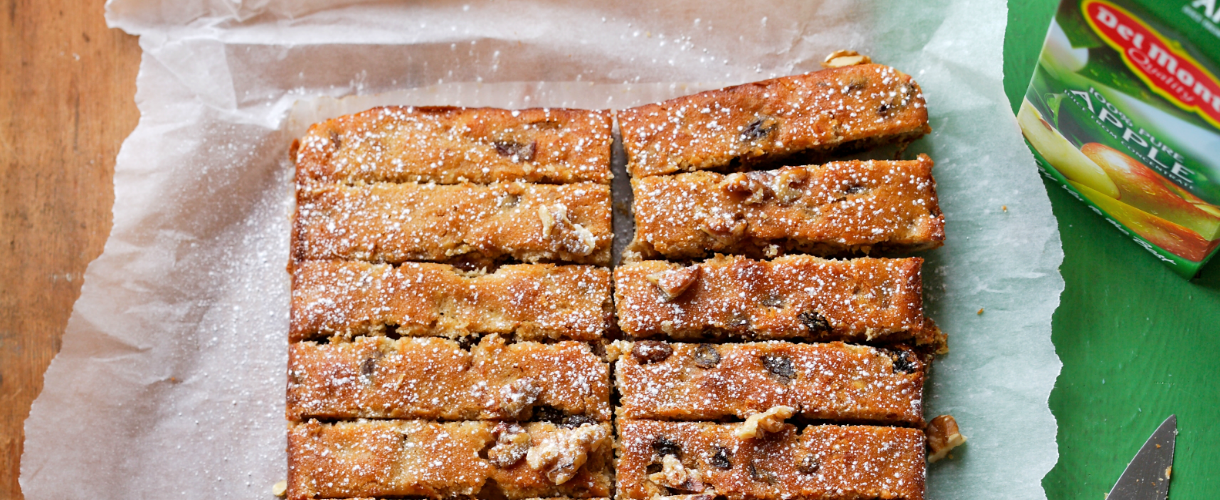 1)Preheat the oven to 180°C/350°F/Gas Mark 4. Lightly grease a 20cm square baking tin. 2)Put the raisins and Del Monte® Apple Juice in a microwaveable bowl and cook on high for one minute. Leave aside to cool. 3)In a mixing bowl, beat the butter and brown sugar together until light and fluffy. Beat in the Del Monte® banana, yoghurt, vanilla essence and egg whites until well combined. Gradually add the flour, beating until just combined. Stir in the raisin mix and the walnuts. 4)Spread the batter into the baking tin and bake for 30 minutes, or until the top is golden. Cool in the tin for 10 minutes before transferring to a wire rack to cool completely. 5)Use a sieve to dust the top with icing sugar and cut into 16 slices before serving.